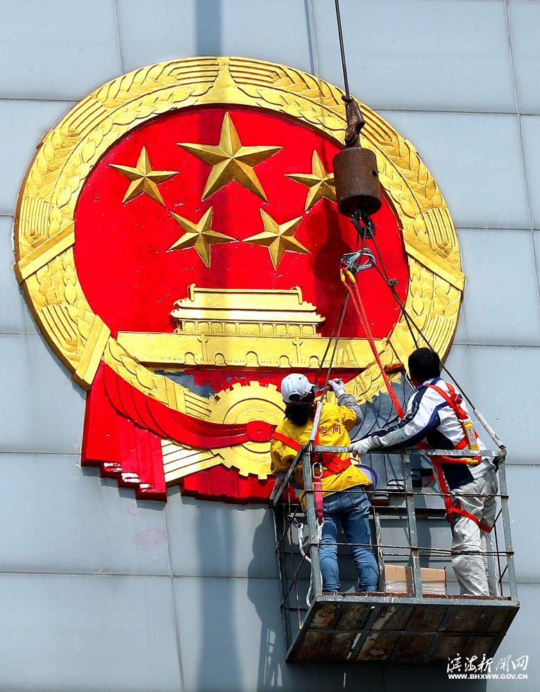 上圖:清水湖公園布置的國慶主題花壇。下圖:9月22日,兩名工人正在給縣行政辦公中心大樓上的國徽重新描漆。