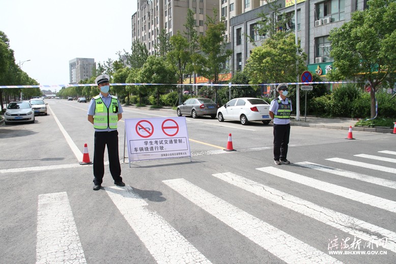 交警在濱海中學(xué)考點(diǎn)附近進(jìn)行交通管制。