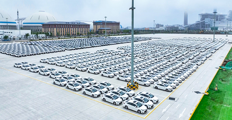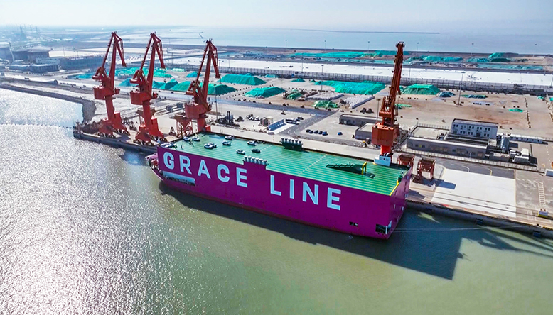 近日,在濱海港區(qū),巴拿馬籍汽車滾裝船“優(yōu)雅”輪??吭诟劭诓次簧稀R惠v輛汽車源源不斷地駛向船艙,即將離岸前往阿聯(lián)酋迪拜。據(jù)了解,“優(yōu)雅”輪本次裝載汽車1163輛,這是濱海港區(qū)單次汽車出口量最多的一個批次。 (本報記者 陳沭宇 攝) (本條新聞版權(quán)歸濱海日報所有,轉(zhuǎn)載請注明出處。)